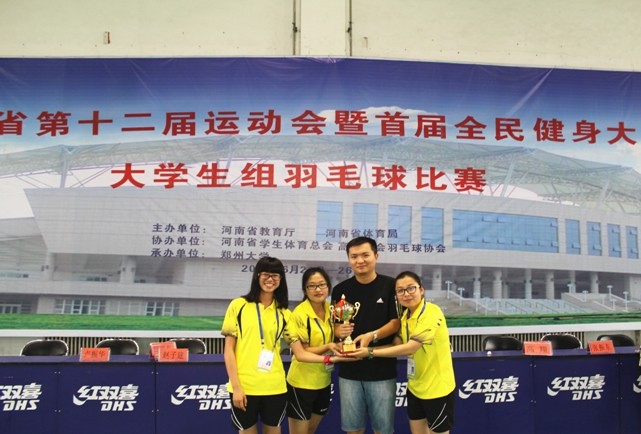 6月26日下午5时,河南省第十二届运动会暨首届全民健身大会大学生组羽毛球比赛在郑州大学圆满落幕。我校首次派出代表队参加比赛。经过五天的角逐,我校代表队在全省30所本、专科团队中脱引而出,一举夺得本科女子甲组团体第三名的良好成绩!