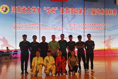 此次锦标赛由河南省教育厅主办,郑州大学西亚斯国际学院体育学院承办。参加本次武术锦标赛的有河南大学、郑州大学、河南理工大学等47支高校代表队,600余人,为历史之最。赛事分甲组、乙组、丙组、武术四段内容,设有21个比赛项目。我院由岳怡靓、许晶晶、李兆旺等9名同学组队,在领队加教练蒋广涛,主教练邱伟、席朝杰的带领下参赛。