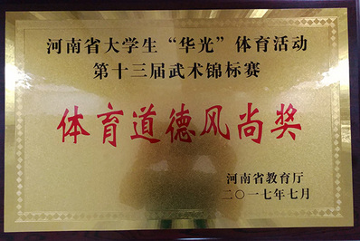 经过四天的激烈角逐,最终,岳怡靓分别荣获女子甲组24式太极拳第一名和女子甲组初级剑术第三名,许晶晶分别荣获本科女子甲组初级枪术第二名和本科女子甲组少林拳第四名,李兆旺荣获本科男子甲组初级枪术第三名,孟青雨本科男子甲组初级枪术第四名,杜秋月荣获本科女子甲组少林拳第六名,陈乐乐荣获“优秀运动员”称号,邱伟老师获得“优秀教练员”称号,我代表队在比赛过程中体现出良好的队伍素质和顽强的比赛作风,再次被河南省教育厅授予“体育道德风尚奖”运动队。
