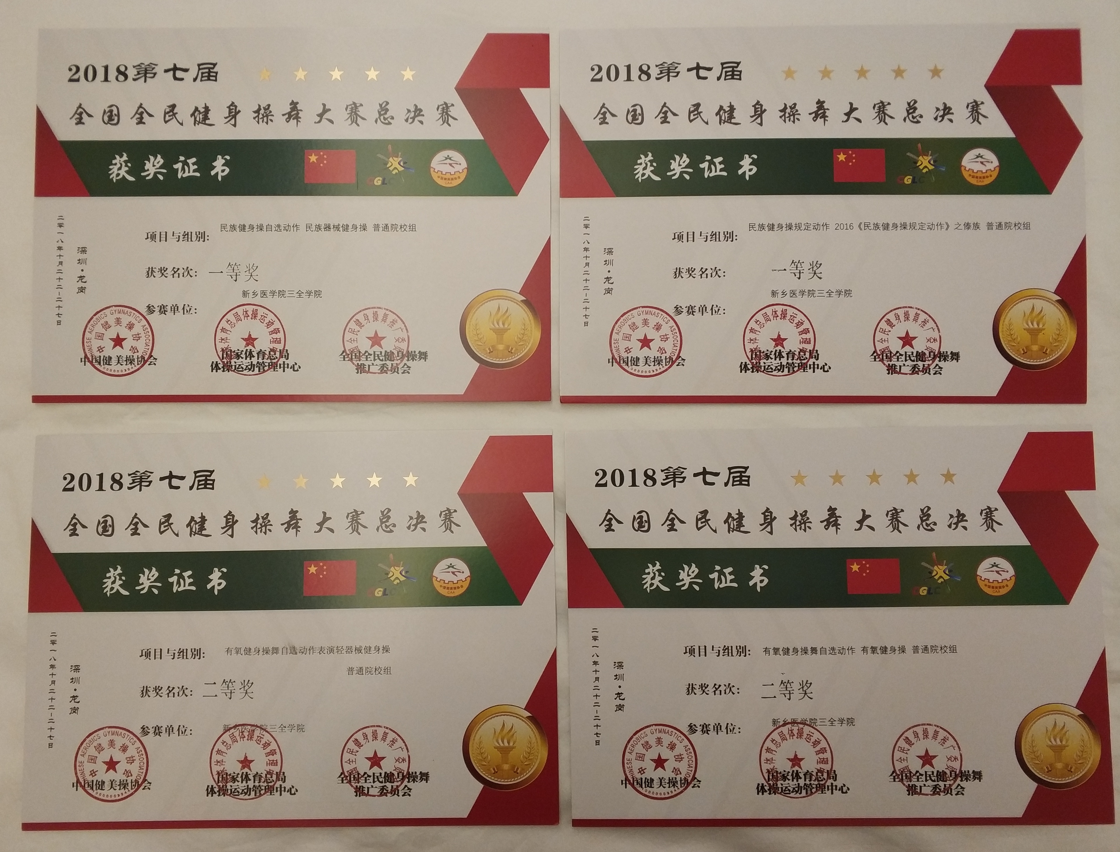 经过激烈角逐,我校赵静怡、范梦珍等8名队员组成的新乡医学院三全学院代表队获得了民族健身操规定动作之傣族一等奖;宋晓颖、杨洋等9名队员组成的代表队获得了民族健身操自选动作民族器械健身操一等奖;席其其格、李薇等8名队员组成的代表队获得了有氧健身操舞自选动作表演轻器械健身操二等奖;赵静怡、范梦珍等9名队员组成的代表队获得了有氧健身操舞自选动作有氧健身操二等奖。张茹茹,齐琦老师荣获“优秀教练员”称号。