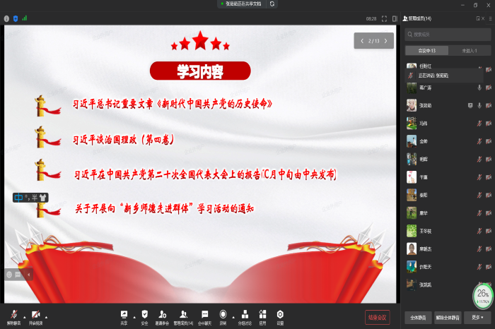 本次会议由理论学习中心组成员张茹茹对《新时代中国共产党的历史使命》、《习近平谈治国理政(第四卷)》、《习近平在中国共产党第十二次全国代表大会上的报告》、《关于开展向“新乡师德先进群体”学习活动的通知》四个学习内容进行了领学,主要学习了作为当代中国共产党员,要谨记我们的使命,义无反顾肩负起实现中华民族伟大复兴,要坚持和发展中国特色社会主义、坚持党的全面领导、坚持人民至上的原则,牢记习近平总书记在二十大全国代表大会上强调的两大务必,工作中要大力弘扬新时期人民教师的高尚师德。