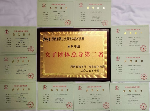 2025年河南省第二十届学生武术比赛于10月20日至26日在洛阳市体育中心成功举办。本次比赛由河南省教育厅、河南省体育局联合主办,河南推拿职业学院承办,吸引了来自全省113所高校的932名运动员同场竞技。在领队杨晓林、教练员席朝杰、程奥、张东元的带领下,我校武术队奋勇拼搏,最终以1项冠军、4项亚军、2项季军、1项第四、1项第五、1项第六的优异成绩,荣膺女子本科甲组团体亚军,充分展现了我校在武术项目上的深厚底蕴与团队实力。